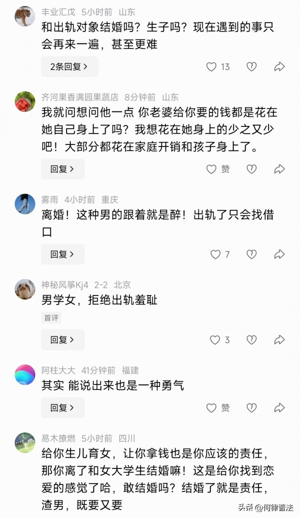 这哪是愧疚,分明是极度的自私!他所谓的"愧疚",恐怕不是对不起老婆,而是怕事情败露,既丢了家庭,又失了"新欢"。这种"既要又要"的心态,正是典型的"渣男"逻辑。网友"我是大张"说得一针见血:"不主动、不拒绝、不负责,这就是渣男的标准。"