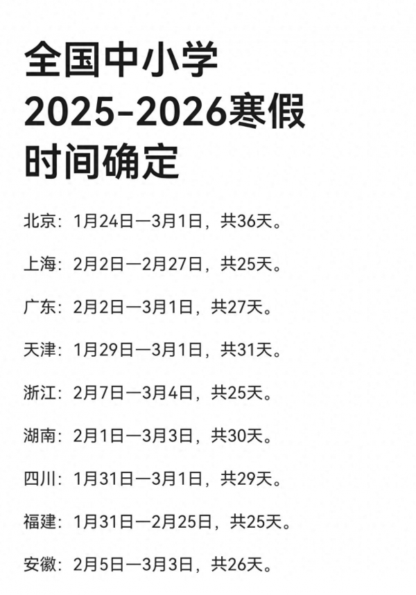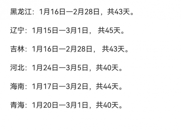 从公布的时间来看,北方省份的寒假普遍偏长,辽宁以45天的假期成为"寒假冠军",黑龙江和吉林紧随其后,均为43天,海南也有44天的长假,让南方不少省份的学生羡慕不已。而上海、浙江、福建的寒假时长最短,只有25天,广东27天、安徽26天,这些省份的孩子假期相对紧凑。北京的寒假从1月24日到3月1日,共36天;天津31天、湖南30天、四川29天,不同地区根据当地教学安排,制定了不同的放假周期。