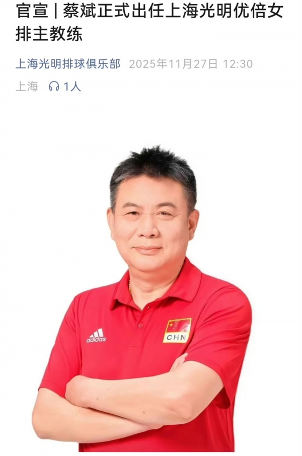 北京时间2025年11月27日消息。今天下午1点,正式官宣:曾经两度执教中国女排国家队的蔡斌,将成为上海女排的主教练。1966年出生的蔡导,在巴黎奥运之后休息了一段时间后,重新出山。