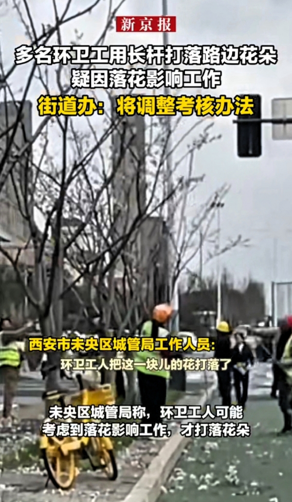 西安环卫工被曝用长杆清除树上花朵,疑因落花影响工作 2026-03-16 16:10 天闻地知 3月15日,西安市民看到未央区龙朔路有环卫工人打落行道树上的花朵。 未央区城管局称,环卫工人可能考虑到落花影响工作,才打落花朵。 市民将情况反映给相关部门,街道办工作人员表示将会协商调整考核办法,避免出现人为打落花朵的情况。