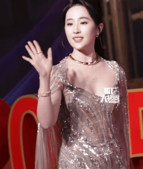 一袭鎏金披肩礼服璀璨而耀眼,修身的长裙勾勒出刘亦菲丰腴的好身材,低胸的衣领小秀性感,抬手向场外粉丝打招呼,微微一笑就是女神级别。