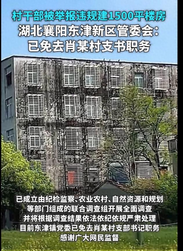 近日,一则关于"村干部被举报违建1500平方米楼房"的网络信息迅速引发公众关注。事件梗概清晰可循:此前,多位网友通过短视频平台反映,湖北省襄阳市东津新区东津镇沈营村党支部书记肖某涉嫌超占土地,违规建设一座五层、建筑面积约1500平方米的楼房,该建筑甚至一度在网络上传播成为所谓的"打卡地"。面对舆情,襄阳市东津新区管委会于4月14日发布情况通报,明确表示高度重视,已迅速组建由纪检监察、农业农村、自然资源和规划等部门联合参与的专项调查组,开展全面核查,并承诺将依据调查结果依法依纪依规严肃处理。目前,东津镇党委已先行免去肖某村支部书记职务。这一连串果断、透明、规范的处置动作,不仅迅速回应了群众关切,更在纷繁复杂的网络语境中,树立了基层权力运行接受监督、有错必纠的鲜明标杆。