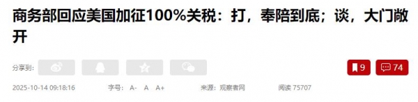 不过,特朗普没有直接回应是否取消对华加征100%关税的计划,说明他现在已经是六神无主了,想与中方和解,摆出了认怂的姿态,嘴上还要展示一下强硬,不能太痛快放弃对华征收关税,担心这样做会有损颜面。
