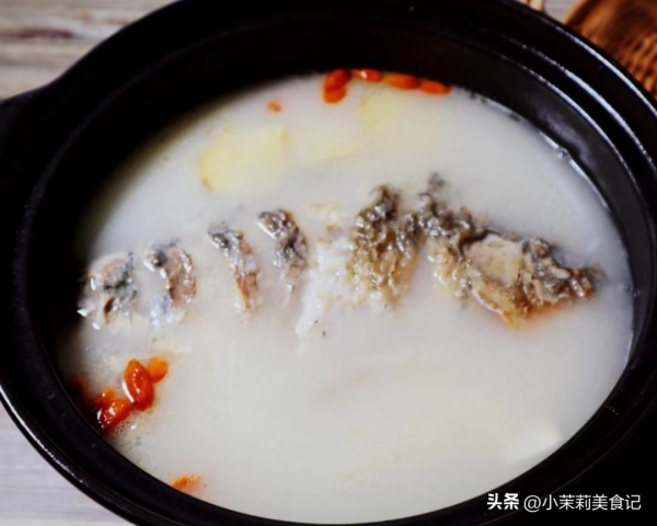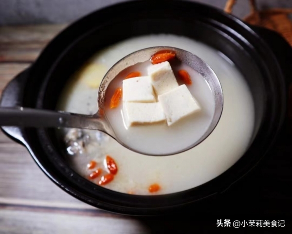 3、接着来准备一块豆腐,改成小方块后,也放进锅里,同鱼一起炖二十分钟。最后往里边调些盐,白胡椒,撒点红枸杞,就做好了。