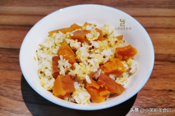 3、一块南瓜,带着皮一起洗干净,切成小块。也放到锅里。过半小时之后,就可以煮了,杂粮饭的程序,充分熟透即可。