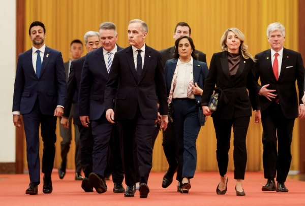 2026年1月16日,加拿大总理卡尼抵达人民大会堂,加拿大工业部长乔利随行(右二)。 IC Photo