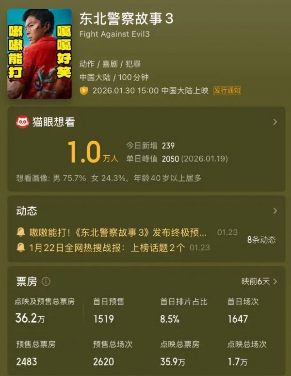 周六的排片更是高达23%,可以说,该片还是来势汹汹的,至少在二月份之前,可以扛得起票房市场了。