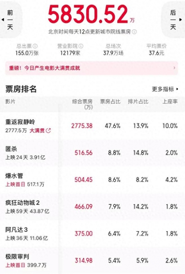 电影《极限审判》就不用说了,首日给了5%的排片,都已经开启了倒挂的模式,今天上映的三部电影,有一部文艺片《翠湖》热度不太高,还有两部都是动画片,票房也存在上限。