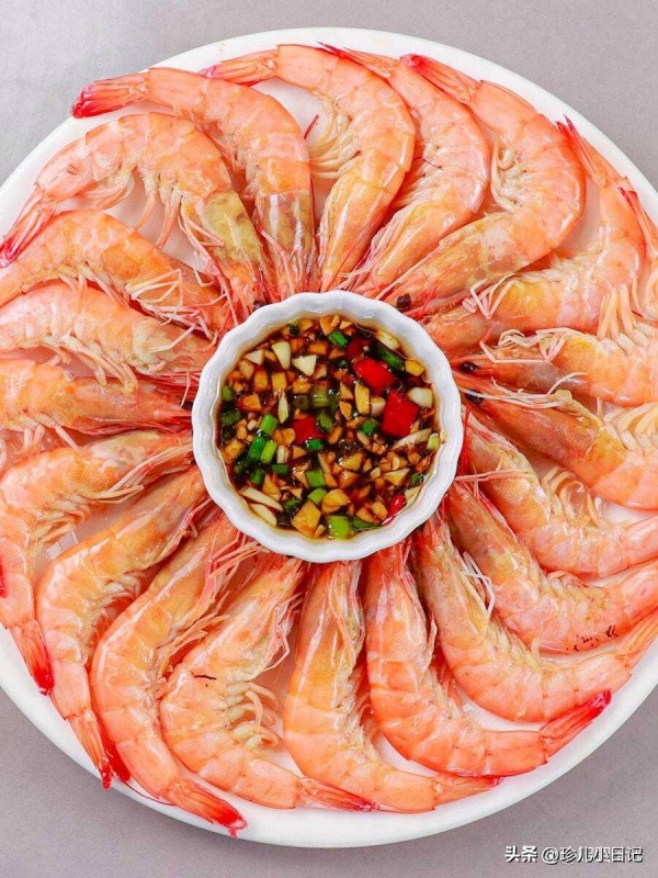 白灼虾最能体现虾的鲜甜原味,操作简单快手。虾身红艳卷曲,寓意新年笑口常开,红红火火,是宴席上最受欢迎的"鲜"味。