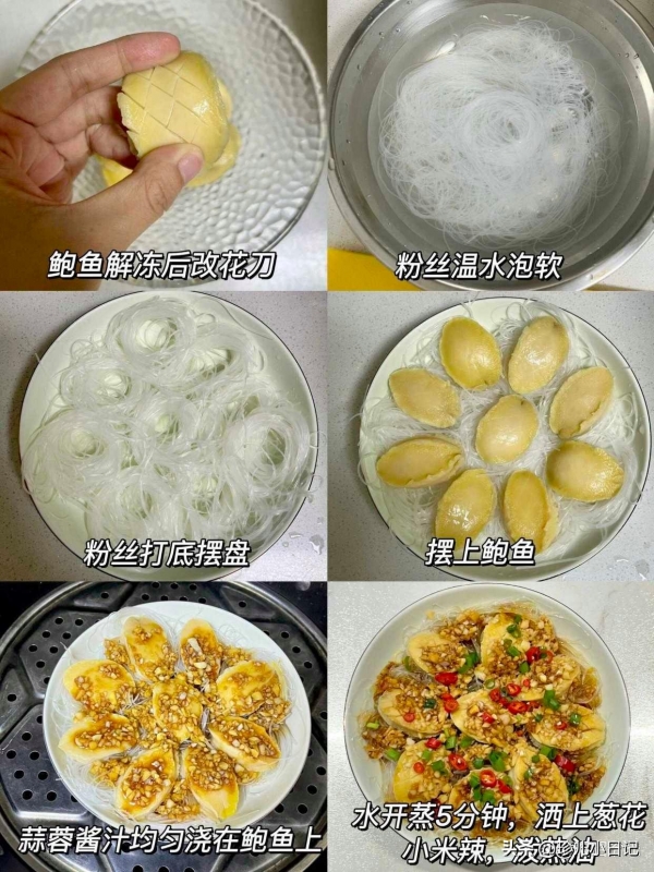 1. 鲍鱼刷净,切十字花刀方便入味。粉丝温水泡软,剪短铺在盘底。