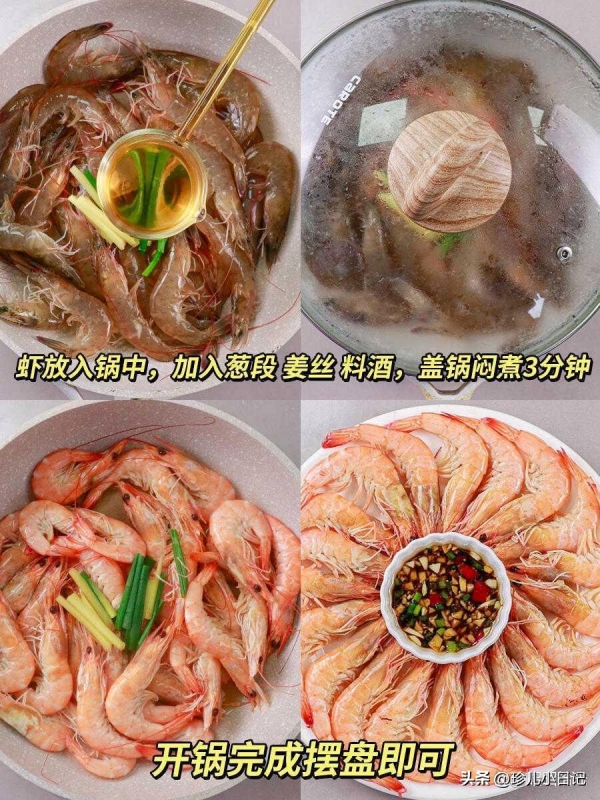 1. 鲜虾剪须去线。锅中水烧开,放姜片、葱段、料酒和几粒花椒,倒入鲜虾煮约1分钟至变红卷曲,立即捞出摆盘,保持鲜嫩。