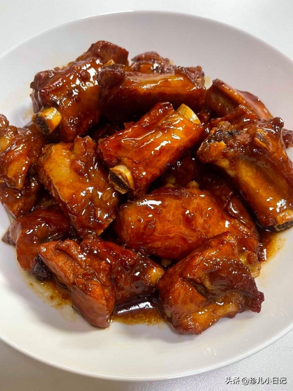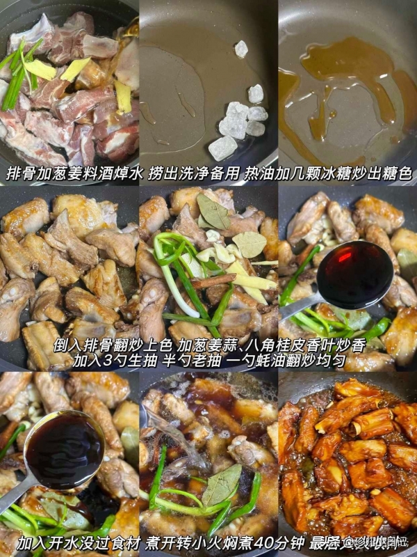 2. 炒糖色是关键:锅里少油,放冰糖小火炒化,变成琥珀色时倒入排骨,快速翻炒让每块都裹上糖色。