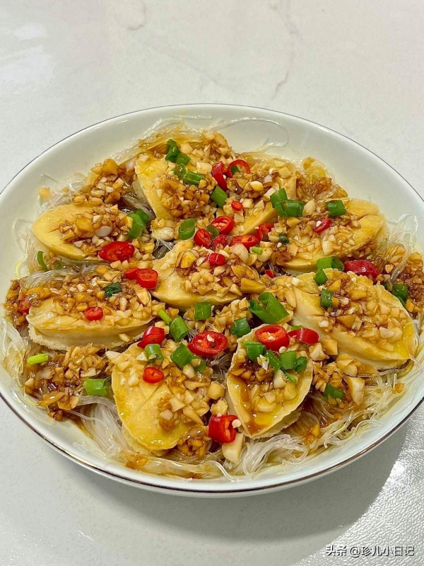 鲍鱼谐音"鲍"佑、"余",是年夜饭上的"富贵菜"。用金银蒜蓉来蒸,蒜香浓郁,粉丝吸饱了汤汁,比鲍鱼还受欢迎,寓意财源滚滚。