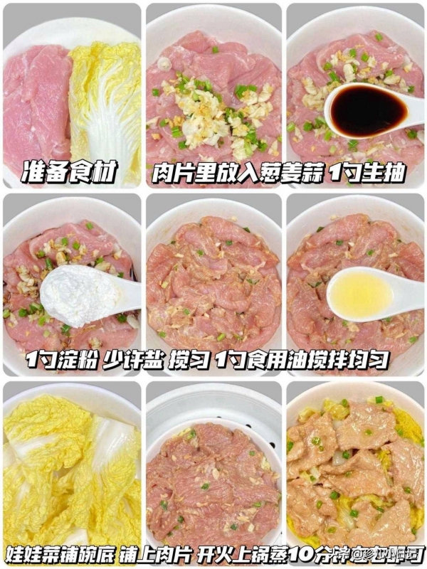 3. 把腌好的肉片平铺在娃娃菜上。蒸锅水烧开后放入,保持大火。