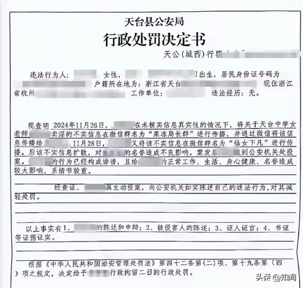 2024年11月,一则"天台某中学女教师卖淫被抓"的不实传言在当地社交圈扩散。95后女教师林淼在两个三人微信群及私聊中参与讨论,未经核实便向好友发送涉事教师何某某的姓名与照片,直接推动传言具象化、扩大化。同案另外两名参与传播的教师张敏、陈慧兰分别被处以行政拘留2日、4日(陈慧兰因怀孕未执行)。