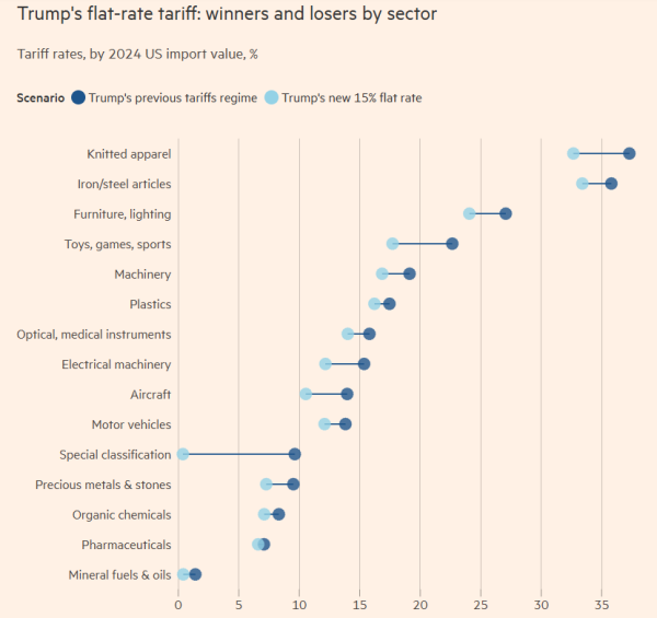 各行业在特朗普原关税体系与新15%统一关税下的税率变化。《金融时报》制图