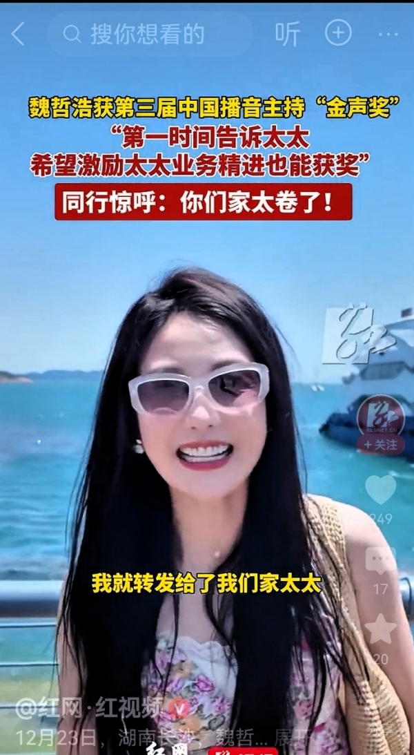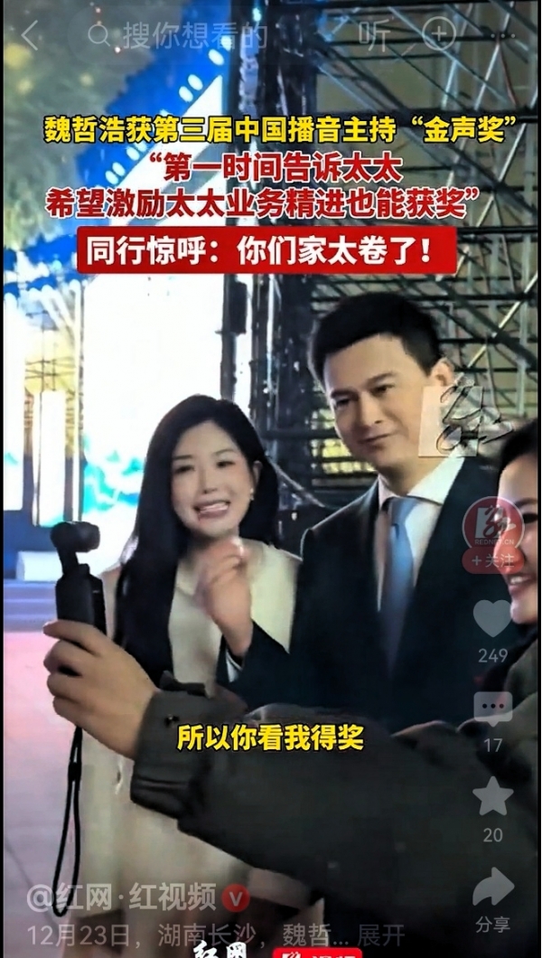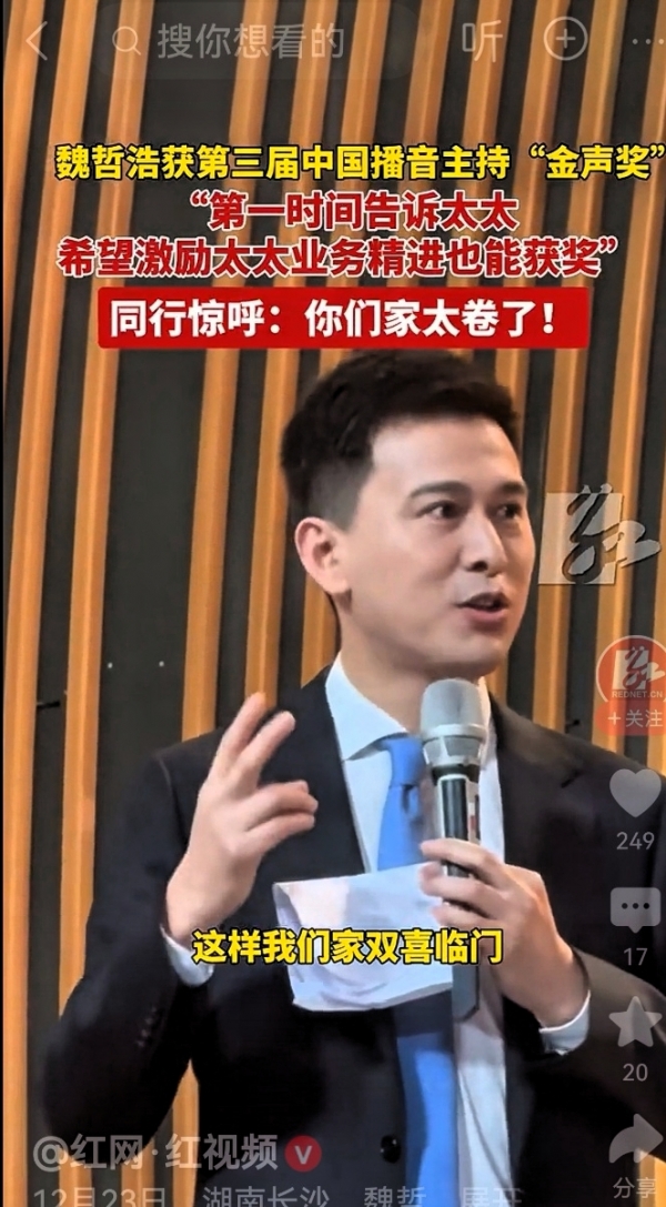 在发言的尾声,魏哲浩提到希望以此次获奖为契机,激励太太精进业务,冲击相关行业奖项。他陈述两人在工作中相互督促的日常状态,说明这一激励并非突发奇想,而是长期以来的相处模式。话音刚落,现场有同行当场发声,用"你们家太卷了"作为回应。这一表述通过麦克风传播至全场,引发短暂的笑声与议论。魏哲浩听到后微笑点头,没有进一步回应,而是以感谢行业、感谢观众的表述结束发言,随后走下舞台。