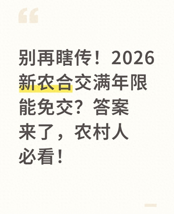 首先,给大家一个最准的信儿:目前,国家并没有统一规定,说城乡居民医保(新农合)交满固定的年限(比如15年、20年),或者到了某个特定年龄(比如65岁、70岁),以后就可以不用交钱了。