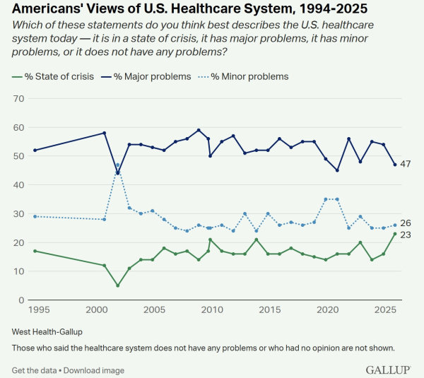 认为美国医疗体系"处于危机状态"的受访者比例高达23%,是自1994年来调查结果中的最高值。