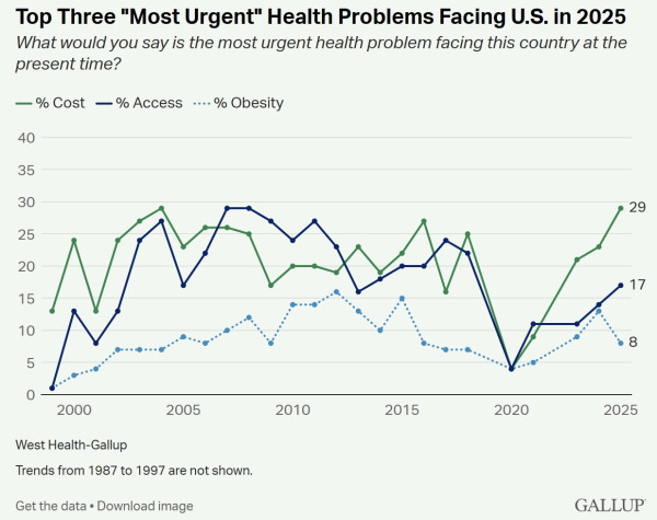 据《卫报》12月31日报道,专注于美国医疗系统研究的非营利性机构West Health-Gallup Center on Healthcare近期开展的民调显示,29%的受访者将"医疗成本"列为美国当前"最亟待解决"的医疗难题。这一数据不仅创下2004年以来的新高,也是1987年该调查启动以来的最高纪录之一;相对的是,仅16%的受访者对美国医疗成本表示满意,这一比例同步跌至历史最低。