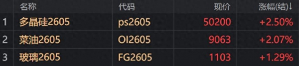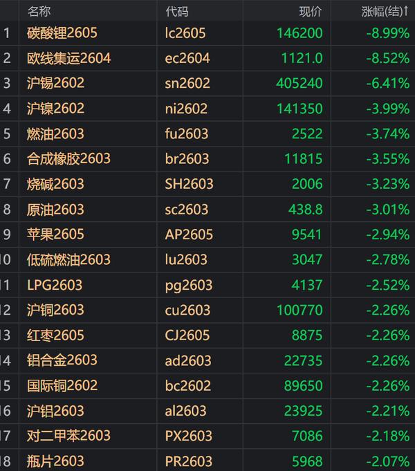 截止收盘,大宗商品以下跌为主。能源、有色金属板块全线下跌,碳酸锂9%跌停,沪锡跌超6%,沪镍、原油、燃油、合成橡胶、烧碱跌超3%,集运跌超8%;涨幅方面,多晶硅、菜油涨超2%。