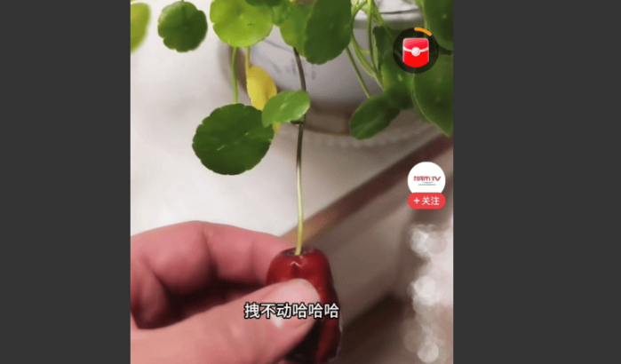从视频上看,男子这盆铜钱草长势不错,在一根铜钱草的叶茎末端长着一颗干枣,男子用手拽了拽,还拽不下来,就像是结了个枣一样。