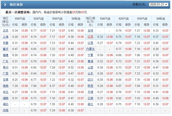 从最新消息了解,截至1月24日,基于周末汽柴油调价休市,本轮周期按照昨日第3个工作日执行,参考本周四原油下降1.8~2%,国内原油变化率回落至1.96%,汽柴油统计上涨幅度收窄至95元/吨,本轮周期预估上涨减至0.08元/升左右!