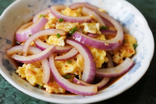 1. 洋葱切丝,鸡蛋打散炒熟备用
