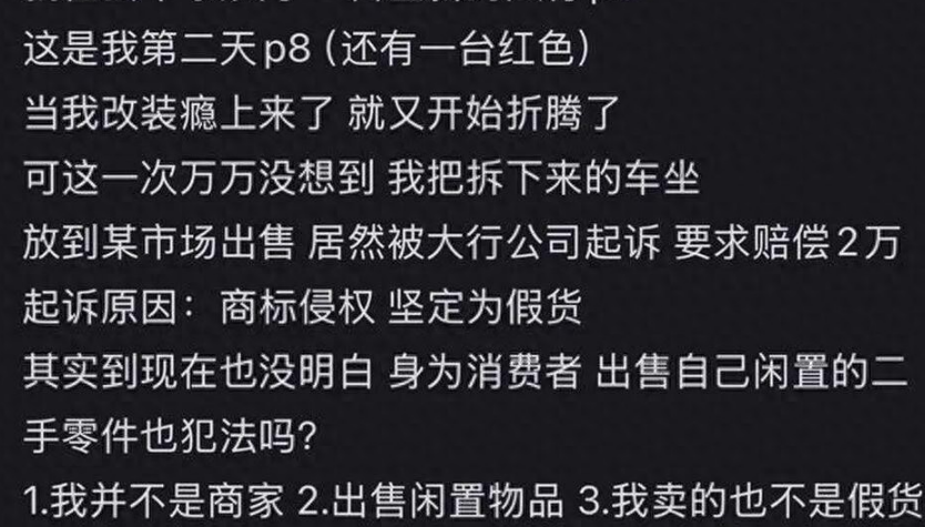 对于"假货"这一核心指控,当事人公开回应称难以理解。他坚持认为,坐垫系整车原装拆下,"我花3000多买的车,现在要我赔20000",并提到自己曾向多位朋友推荐过该品牌。