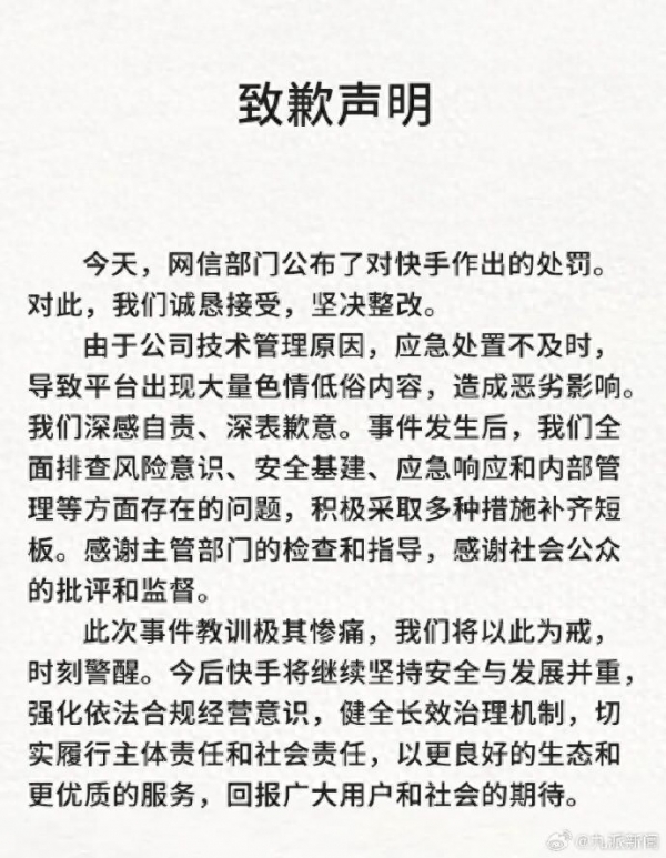 今天,网信部门公布了对快手作出的处罚。对此,我们诚恳接受,坚决整改。