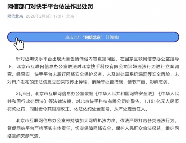 2月6日,北京市互联网信息办公室依据《中华人民共和国网络安全法》《中华人民共和国行政处罚法》等法律法规,对北京快手科技有限公司处警告、1.191亿元人民币罚款处罚,同时责令其限期改正、依法依约处置账号、从严处理责任人。