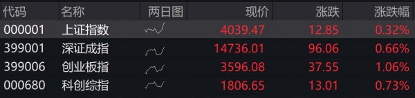 4月15日,A股四大指数集体高开,上证指数涨0.32%,深证成指涨0.66%,创业板指涨1.06%创10年多新高,科创综指涨0.73%。
