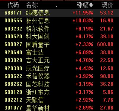 具体来看,量子科技概念股高开,神州信息涨停,纬德信息涨超10%,格尔软件、科大国创、国盾量子、富士达、吉大正元跟涨。