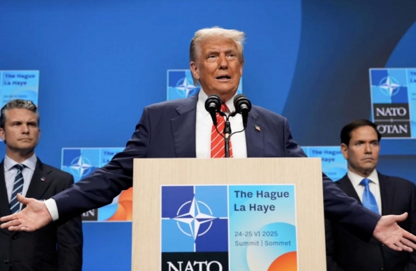 2025年6月,特朗普在北约首脑峰会上强调盟国提高国防预算目标,并称其是"对西方共同安全的成功"。图源:美联社