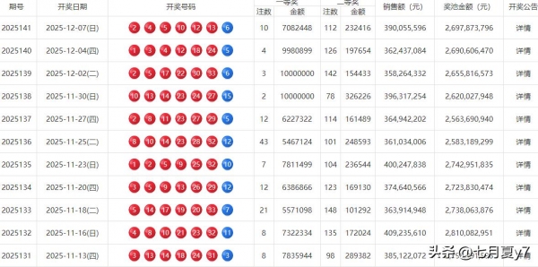 2025年12月7日,双色球第2025141期开奖,全国销售额390,055,596元,开奖号码为红球02、04、05、10、12、13,蓝球06。