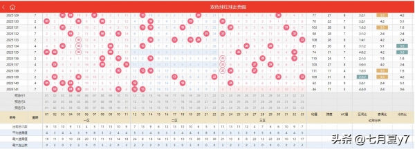 本期号码最突出的是偏态特征:红球三区(23-33)轮空,近30期仅出现3次,概率不足10%;一区(01-11)出号4个,远超历史同期2.8个的均值。