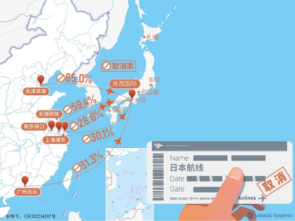 据航班管家最新监测数据显示,未来两周(12月23日至1月5日)共有46条中日航线取消全部航班,涉及中国26座城市和日本18座机场。截至12月22日,2026年1月中国大陆赴日航班的取消量已达2195班次,取消率高达40.4%。