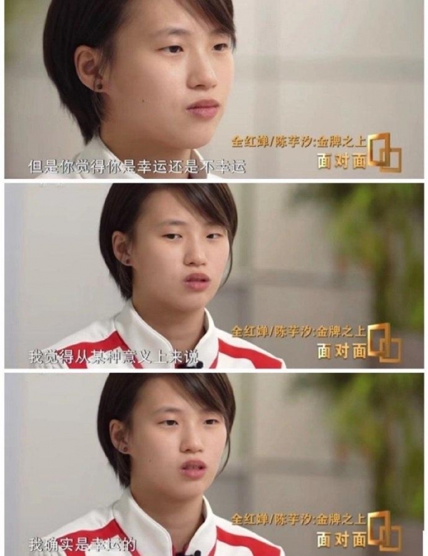 陈芋汐:但是更多的时候我觉得自己是幸运的,我觉得某种意义上来讲,我确实是幸运的。因为对于跳水来讲,拿到450分是一个非常难的门槛,很多人其实是达不到这一个分数的。如果没有她的存在,可能我的运动生涯,并不会达到这么高的水平。