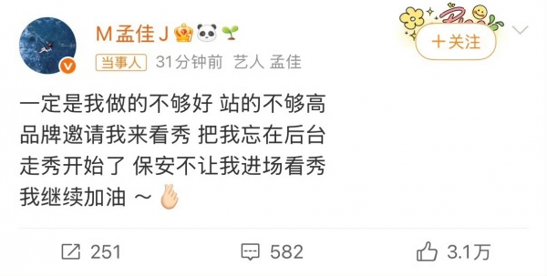 面对这场离谱乌龙,孟佳没有发飙指责,反而在微博温柔自嘲:"一定是我做的不够好,站得不够高,品牌邀请我来看秀却把我忘在后台……保安不让我进场看秀。"结尾还暖心表态"我继续加油",格局拉满。