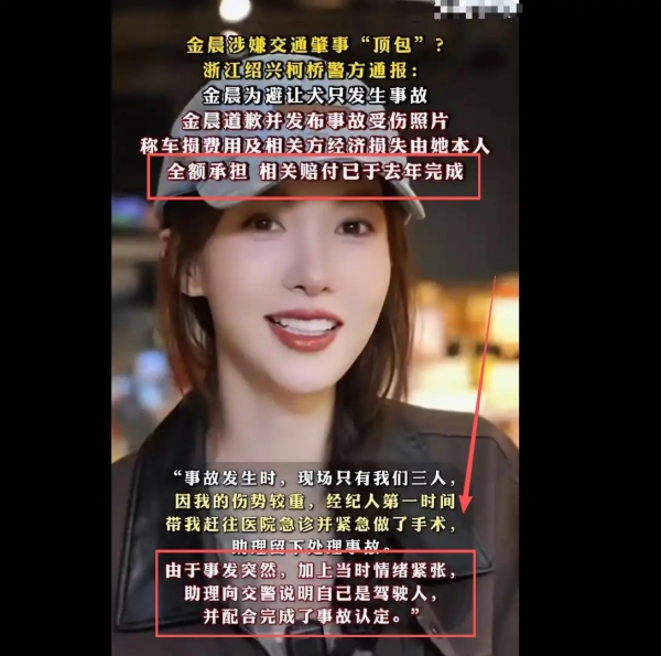 金晨是实际驾驶人,离场为紧急就医,不存在酒驾、骗保情况;助理顶包属实,将依法处理,涉及交通违法行为将依法依规予以处理,其他有关问题还在进一步核查中。强调法律面前人人平等。不信谣不传谣。