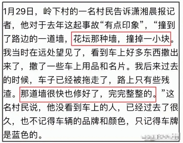 当地村民也出来说了,其实车祸现场压根不算严重,就撞坏了一小块围墙。