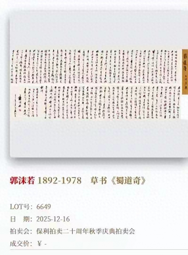 平静被2025年12月的一则拍卖公告打破。北京保利二十周年秋拍官宣,这幅《蜀道奇》将亮相12月16日的书画夜场,800万元起拍价瞬间点燃收藏圈。可就在众人热议天价时,郭沫若之女郭庶英的律师声明如平地惊雷:"作品是父亲亲赠,我保管数十年从未转让,如今早已遗失,已向北京警方报案!"