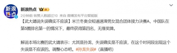 作为本届米兰冬奥会的解说嘉宾,武大靖对孙龙的失误表示明显不满,他直言:"尤其是孙龙这个失误,确实是不应该,在这个时间段出现这样的失误,是不应该的。"武大靖在解说中详细分析了比赛形势:"一个第二的位置,其实位置非常好的,对咱们来说已经非常好了,你给刘少昂两个身位的位置就够了,你的任务就完成了。"