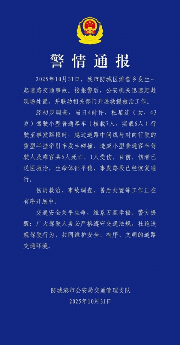 经初步调查,当日4时许,杜某连(女,43岁)驾驶小型普通客车(核载7人,实载6人)行驶至事发路段时,越过道路中间线与对向行驶的重型半挂牵引车发生碰撞,造成小型普通客车驾驶人及乘客共5人死亡,1人受伤。目前,伤者已送医救治,生命体征平稳,事发路段已经恢复通行。