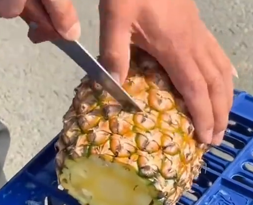 和传统逐点挖眼的办法不一样,他顺着凤梨的弧度和果眼纹路下刀,既不浪费果肉,也不会弄得满手流汁,干净利落。