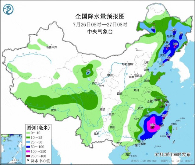 降水预报:7月26日08时至27日08时,台湾岛南部、福建、浙江南部、广东东部、江西中东部等地有暴雨到大暴雨,福建西南部等地有特大暴雨(250~350毫米)。