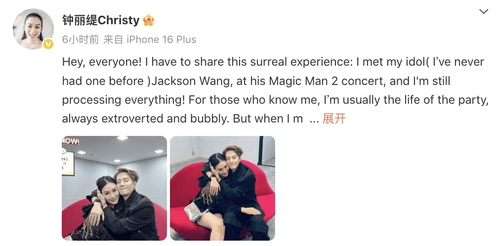 10月8日,钟丽缇在社交平台晒出与王嘉尔的亲密贴脸合照,并发布长文分享这段"超现实经历"。她难掩激动地写道:"必须告诉大家--我在他的'Magic Man 2'演唱会上见到了我的偶像王嘉尔,直到现在我还沉浸在当时的氛围里!"