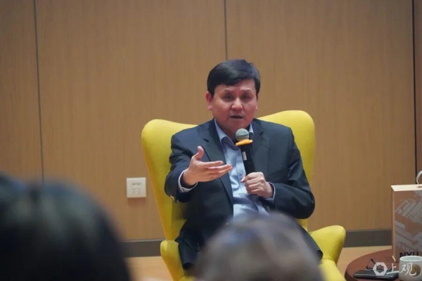 他一身深灰色西装,像是在跟朋友聊天,而不是做一场学术报告,他直白地告诉大家,PPT是昨天夜里想起才开始新做的,以至于"黑眼圈挺重的"--一如既往的幽默,引得台下常响起笑声。