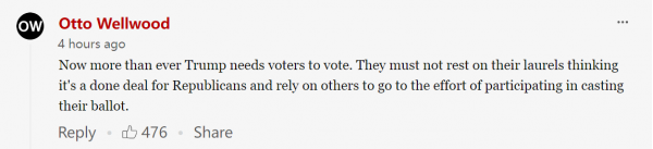 网友A:现在比以往任何时候都更需要选民投票。特朗普必须提醒选民不要自满,认为共和党已经胜券在握,而是要积极参与投票,不能依赖他人去投票。