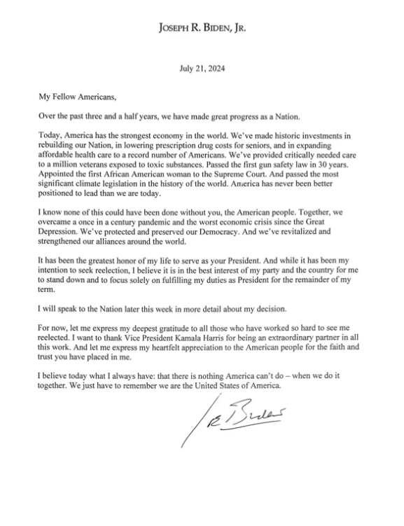 主要内容是支持现任女副总统哈里斯接替他成为新的候选人,内容如下: